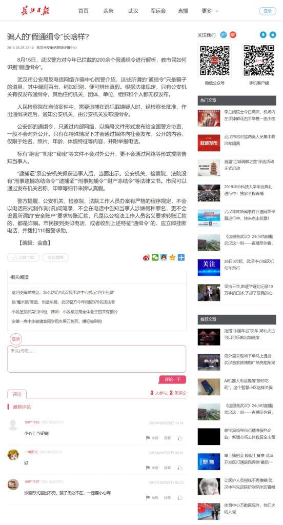 9.2018-08-26 22:19在長江日報上,武漢市反電信網路詐騙中心發布了一篇文章,文章標題為「騙人的“假通緝令”長啥樣?」文章內容說的就是諸如此類子虛烏有的通緝令。