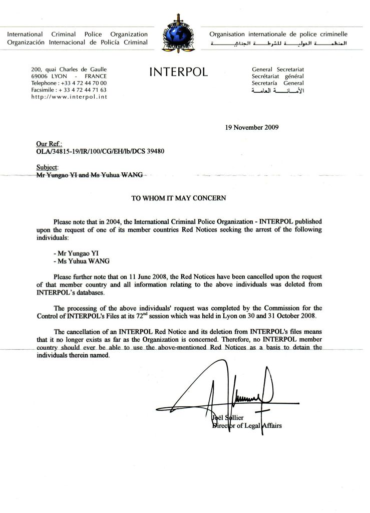 8.二○○四年底,國際刑警組織雖然根據中方申請發出《紅色通緝令》,但就在當時很快就發現案件疑點,因此立即重新立案,展開了為期三年多的詳細調查。國際刑警最後確定這是迫害誣陷羌佛的假案。同時中國有關部門也核查到義雲高無犯罪事實,遂於二○○八年六月十一日主動打報告請求國際刑警撤銷通緝,試想,如果有罪,中國會主動請求撤銷嗎?二○○八年十月在第七十二屆「國際刑警組織文件控制委員會」大會上,通過結論:無罪,國際刑警正式宣佈撤除「義雲高」《通緝令》及整個案件,並正式下文告知全世界各成員國不准留置「義雲高」,國際刑警還專門致函第三世多杰羌佛陳述了經過。