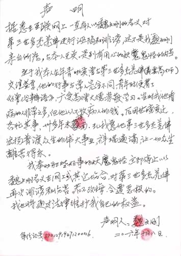 十多年來,H.H.第三世多杰羌佛不論被世人如何陷害誹謗,都以慈悲為本,從來不以“國際刑警組織”的撤除通緝令鐵證函件等事實來證明自己的清白。祂對“世界和平獎評定委員會”調查人員說,“我要做的是:眾生的一切造業罪過由我承擔,我種的一切善業功德全給你們。拿出來清白了我,誹謗我的人就不清白了,他們的罪業誰承擔?”這就是羌佛的誓願與慈悲。但是,一些誣衊、誹謗H.H.第三世多杰羌佛的人,蒙蔽了某些媒體,編造報導H.H.第三世多杰羌佛是壞人,還編造出羌佛青少年時代的好友魏文剛說羌佛不是一個好人等等,事實上這些媒體完全是無中生有,在編造謊話欺騙大眾,事實是精武館館長魏文剛對藉用他的名義來誹謗羌佛的造謠媒體十分惱怒,親自寫了證詞聲明: