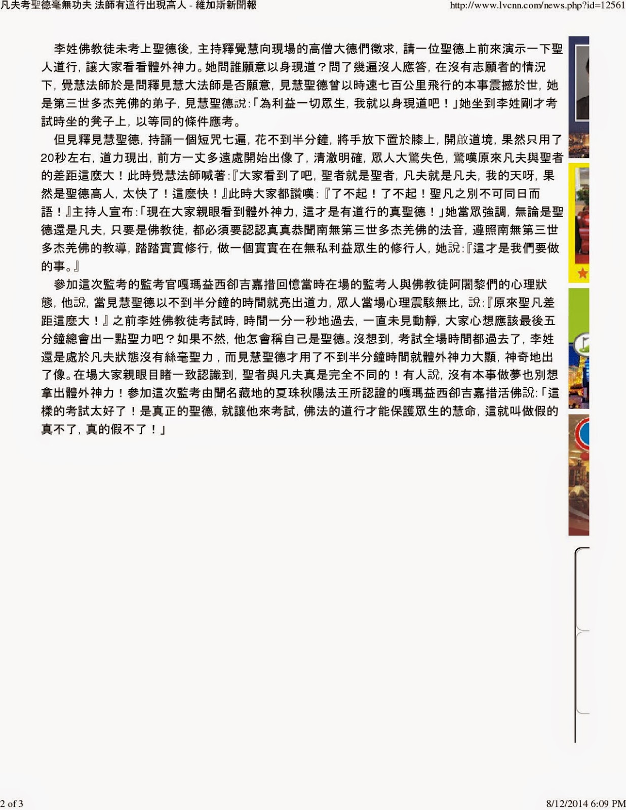 李姓考生兩年前曾號稱自己是聖德,乃至嚴重違反戒體犯下重戒,國際佛教僧尼總會將其除名,因此李姓佛教徒這次來想看看證明自己有沒有真正的道行,便向聯合國際世界佛教總部提出考聖德的申請書。結果當天考試的現場已經證明了他照常是凡夫,但考官勉勵他說:其實你能夠自己要求申請考試就是不錯的,這次考試不過關,便是說明,你現在還不是聖德,並不代表你未來也不會成為聖德,所以不要灰心,只要能夠好好恭聞南無第三世多杰羌佛的法音,學習 <解脫大手印>與<藉心經說真諦>,研學辦公室公告等,切實修行,樹立正知正見,提高自己,等自己有了聖人道行了,再來考試。